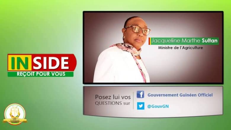 Conakry, le 31 Mars 2017 – La ministre de l’Agriculture, Jacqueline Marthe Sultan, est l’invitée de l’émission INSIDE dont la diffusion démarre ce vendredi 31 Mars 2017. Au cours de cette interview, Jacqueline M. Sultan a abordé plusieurs questions essentielles relatives au développement de notre potentiel agricole à travers les réformes entamées et qui ont produit des résultats ces dernières années ainsi que les nombreux challenges qu’il reste à relever.