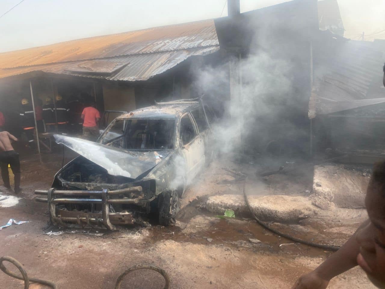 Si aucune perte en vies humaines n’est à déplorer, les dégâts matériels sont importants. Plusieurs boutiques et kiosques de transfert d’argent ont été touchés, tandis que le véhicule a été entièrement réduit en cendres.