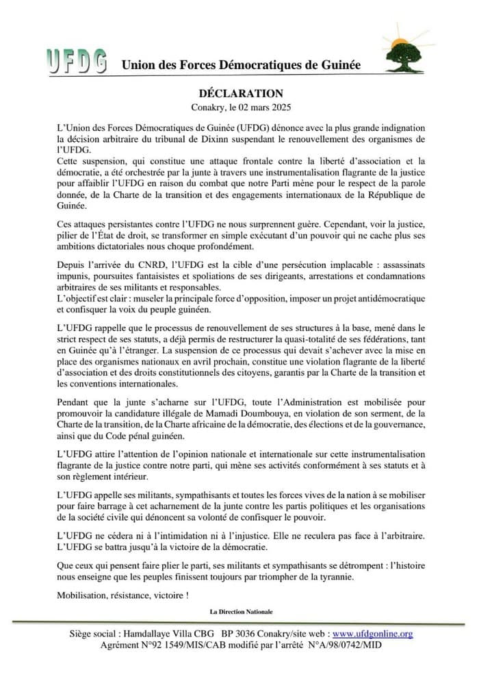 Dans sa déclaration, l’UFDG affirme qu’elle « ne reculera pas » face à cette injustice. Une posture ferme, mais avec quels moyens ?