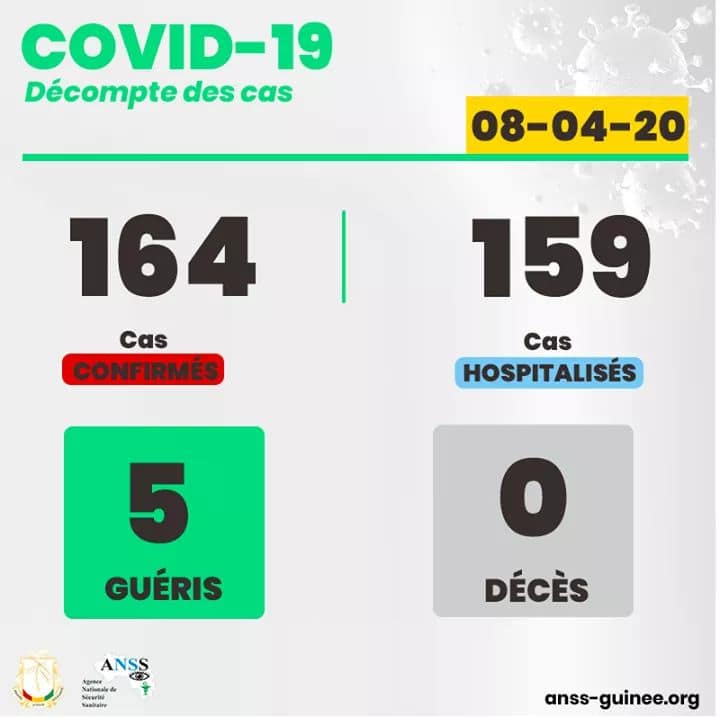 CORONAVIRUS | GUINÉE Vingt (20) nouveaux cas ont été enregistrés à la date du mardi 07 Avril 2020 selon l’ANSS l’agence Nationale de Sécurité Sanitaire. Ces nouveaux cas portent à 164, le nombre de cas confirmés dans le pays depuis le 12 mars 2020 dont cinq (5) sortis guéris.