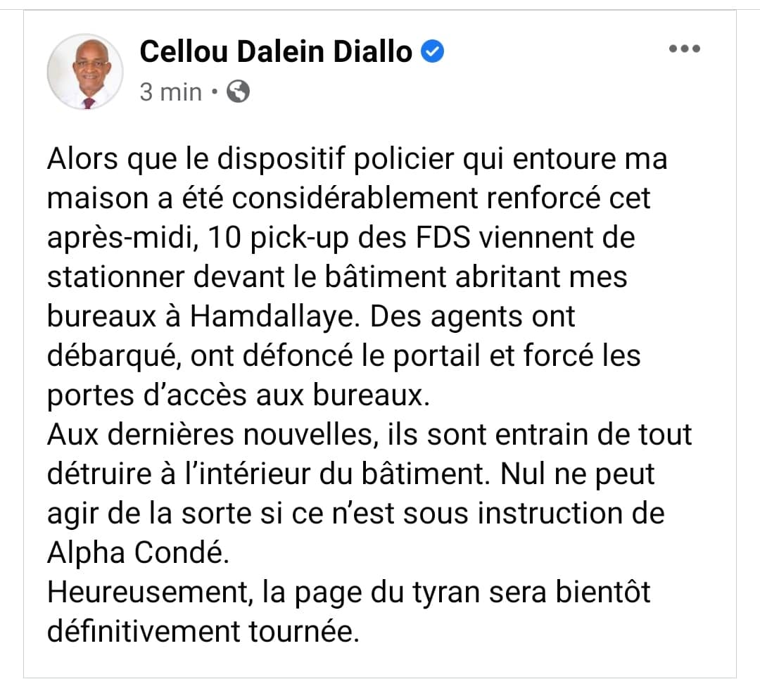 Alors que le dispositif policier qui entoure ma maison a été considérablement renforcé cet après-midi, 10 pick-up des FDS viennent de stationner devant le bâtiment abritant mes bureaux à Hamdallaye. Des agents ont débarqué, ont défoncé le portail et forcé les portes d’accès aux bureaux.