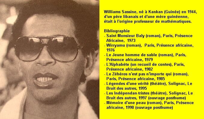 Williams Sassine a été décrit comme un écrivain de la marginalité. Marginalité et errance. Cela commence par la naissance à Kankan en Haute-Guinée d’un père arabe libanais et d’une mère guinéenne malinké. De 1973 à 1998, il publie 8 romans, un recueil de contes et une pièce de théâtre. L’exil, c’est une vie de marginalité et d’errance qui commence par de la prison à l’âge où on passe le baccalauréat.