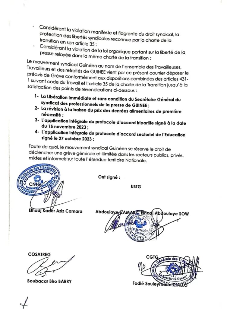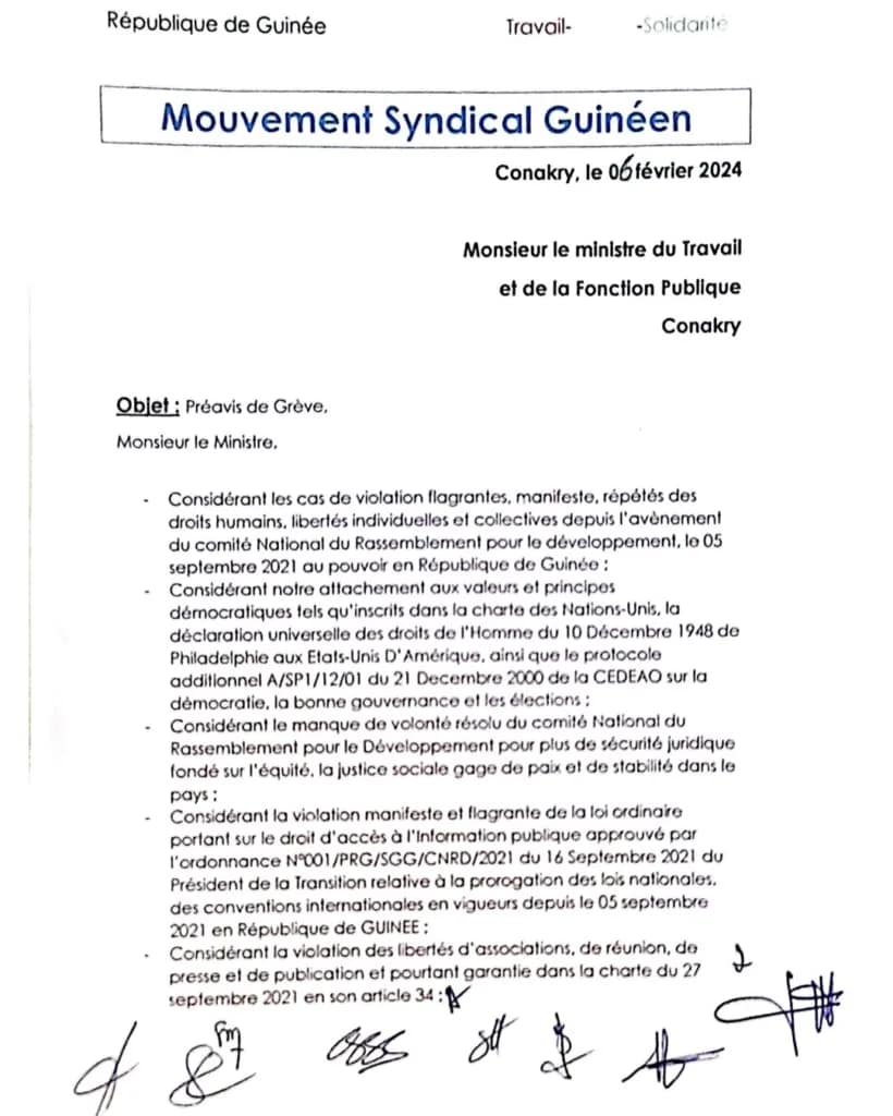 Conakry, le 6 février 2024 – Le climat social en Guinée connaît une tension montante. Le Mouvement Syndical Guinéen a adressé un préavis de grève au ministre du Travail et de la Fonction Publique. La correspondance date du 6 février 2024, exprimant des griefs sérieux et des demandes précises, sous menace d’une grève d’envergure nationale.