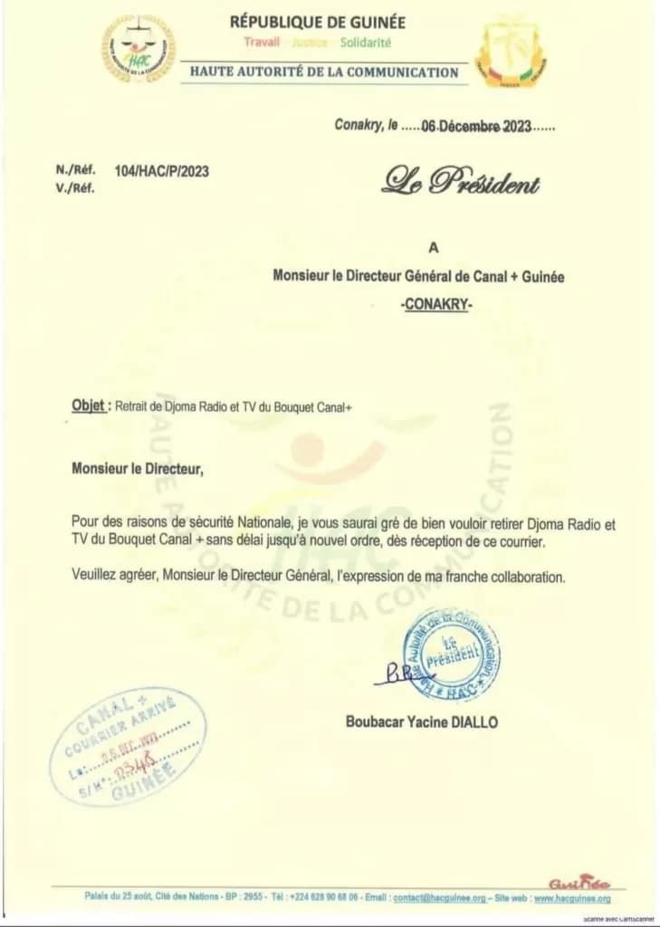 La récente missive émise par la Haute Autorité de la Communication de la République de Guinée a déclenché des ondes de choc bien au-delà des frontières de la salle de rédaction. Le document, signé de la main de son président, Boubacar Yacine Diallo, ordonne le retrait de Djoma Radio et TV du bouquet Canal+, citant des motifs nébuleux de « sécurité Nationale ». Cette manœuvre est la quintessence même de la censure, un acte qui s’inscrit dans une série de mesures répressives orchestrées par la junte militaire au pouvoir, et maintenant ratifiées par ceux censés protéger la liberté de la presse.