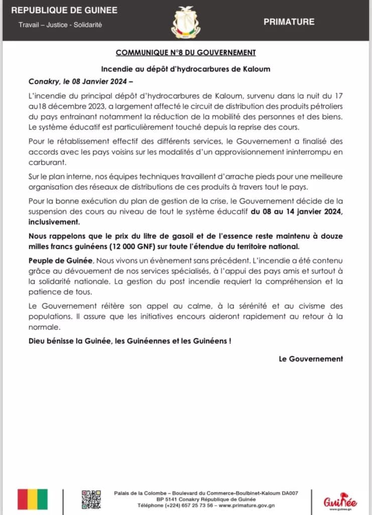 Le gouvernement de la Guinée a émis un communiqué le 8 janvier 2024, soulignant les efforts déployés pour rétablir les services et assurer un approvisionnement continu en carburant grâce à des accords avec les pays voisins. Des équipes techniques ont été mobilisées pour améliorer l’organisation des réseaux de distribution des produits pétroliers à travers le pays.