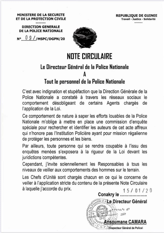 Info/Sécurité : La Direction Générale de la Police Nationale s’indigne face au comportement de certains agents lors du maintien d’ordre en Guinée et annonce la mise en place d’une commission d’enquête spéciale.