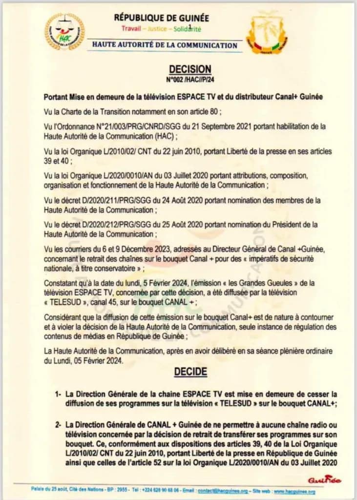 Espace TV et le distributeur Canal+ Guinée officiellement mis en demeure par la HAC.