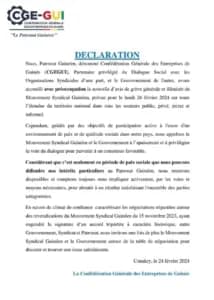 La déclaration de la Confédération Générale des Entreprises de Guinée (CGE-GUI) exprime une préoccupation claire concernant l’avis de grève générale annoncé pour le 26 février 2024. Elle souligne l’importance de la paix sociale pour la défense des intérêts particuliers des entreprises et encourage un dialogue constructif entre le gouvernement, le patronat et le mouvement syndical, rappelant un accord historique atteint précédemment.