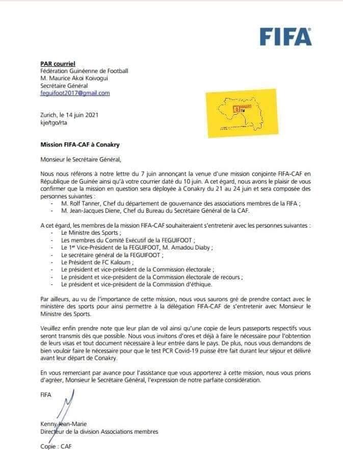 Voici le courrier de la FIFA en date du 14 juin adressé à la Fédération Guinéenne de Football, qui détermine la composition des membres de la Mission conjointe FIFA-CAF, qui va séjourner à Conakry du 21 au 24 juin 2021 et les personnes qui seront rencontrées à cet effet.