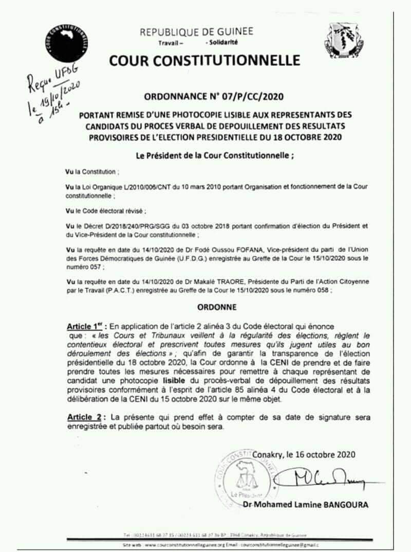 La Cour Constitutionelle ordonne la remise d’une copie LISIBLE du Procès Verbal de dépouillement des résultats provisoires, conformément à l’esprit de l’article 85.4 du code électoral.
