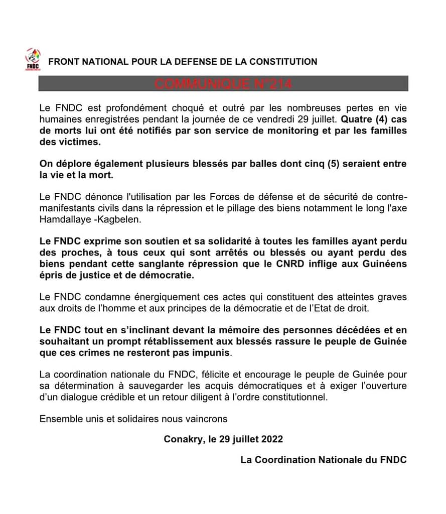 Manifestation | Le #FNDC annonce 4 morts ce vendredi 29 juillet 2022 et plusieurs blessés par balles dont cinq (5) seraient entre la vie et la mort.