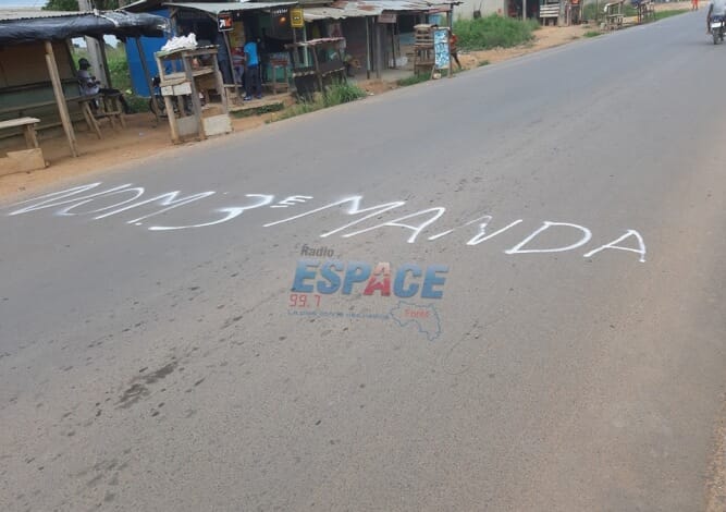 La semaine dernière, juste à la rentrée de la ville, au niveau de l’arc de triomphe, des jeunes anti troisième mandat ont écrit sur la route des slogans hostiles au régime. On pouvait lire par exemple: « Hopaïpèli », « Pas de troisième mandat » ou encore « la forêt dit NON ». Un comportement jugé <