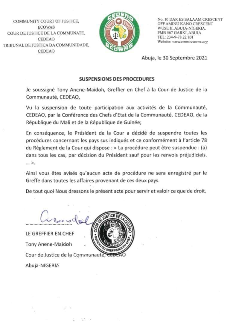 Toutes les procédures concernant le Mali et la Guinée suspendues au niveau de la Cour de Justice de Ecowas – Cedeao. Motif : les coups d’Etat et la suspension des 2 pays de toute participation aux activités de l’institution.